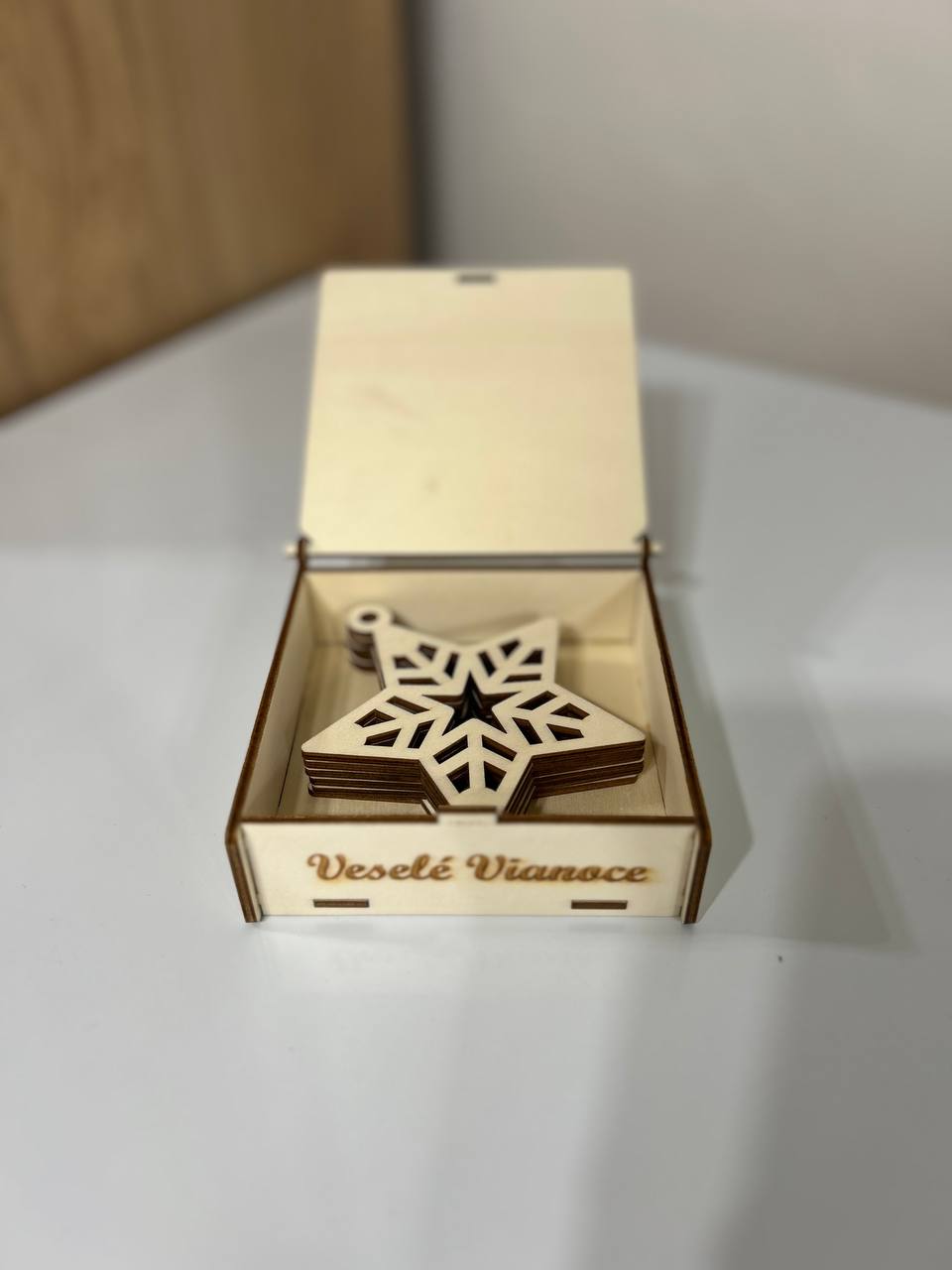 Drevena ozdoba. Drevena krabica ( 11x11xx4 cm ) a 6 kusov ozdoby (8 cm).