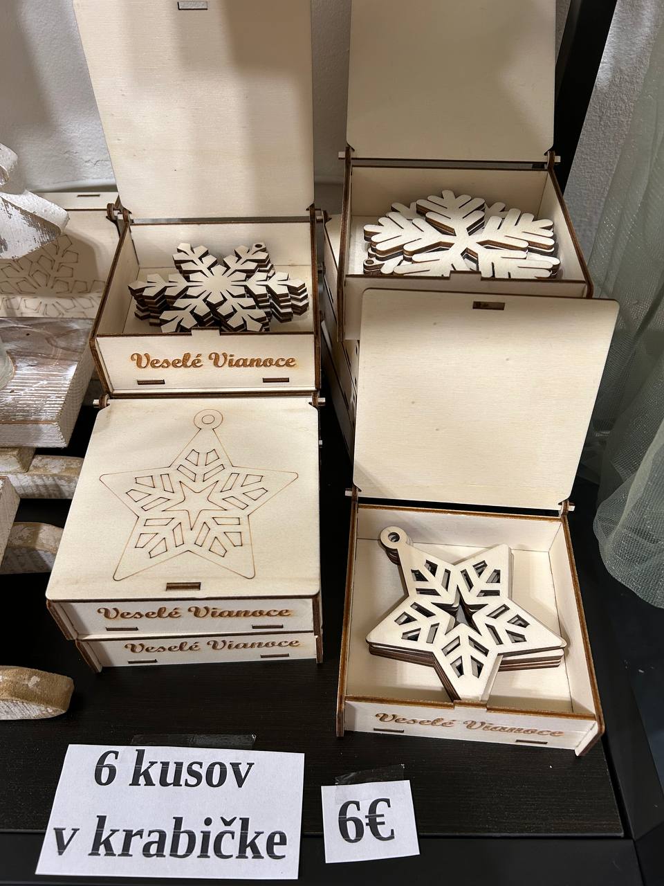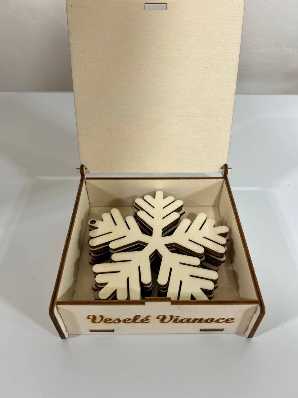 Drevena ozdoba. Drevena krabica ( 11x11xx4 cm ) a 6 kusov ozdoby (8 cm).